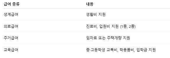 생계, 주거, 교육, 의료 급여 제공 + 각종 감면 혜택
