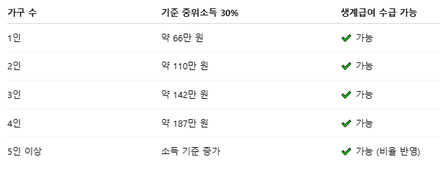 - 4인 가구 기준 → 약 187만 원 이하일 경우 가능